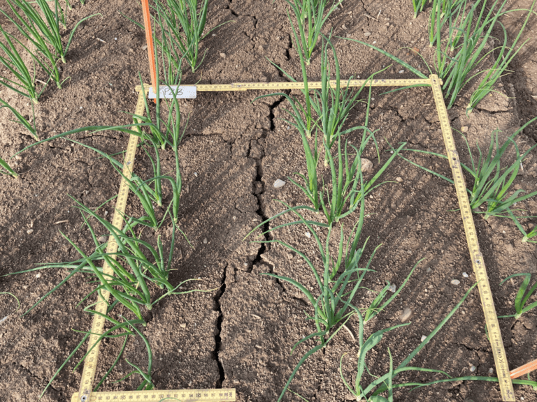Onion plot treated with ARA. Precise spraying ensures clean rows and vigorous, healthy crops.