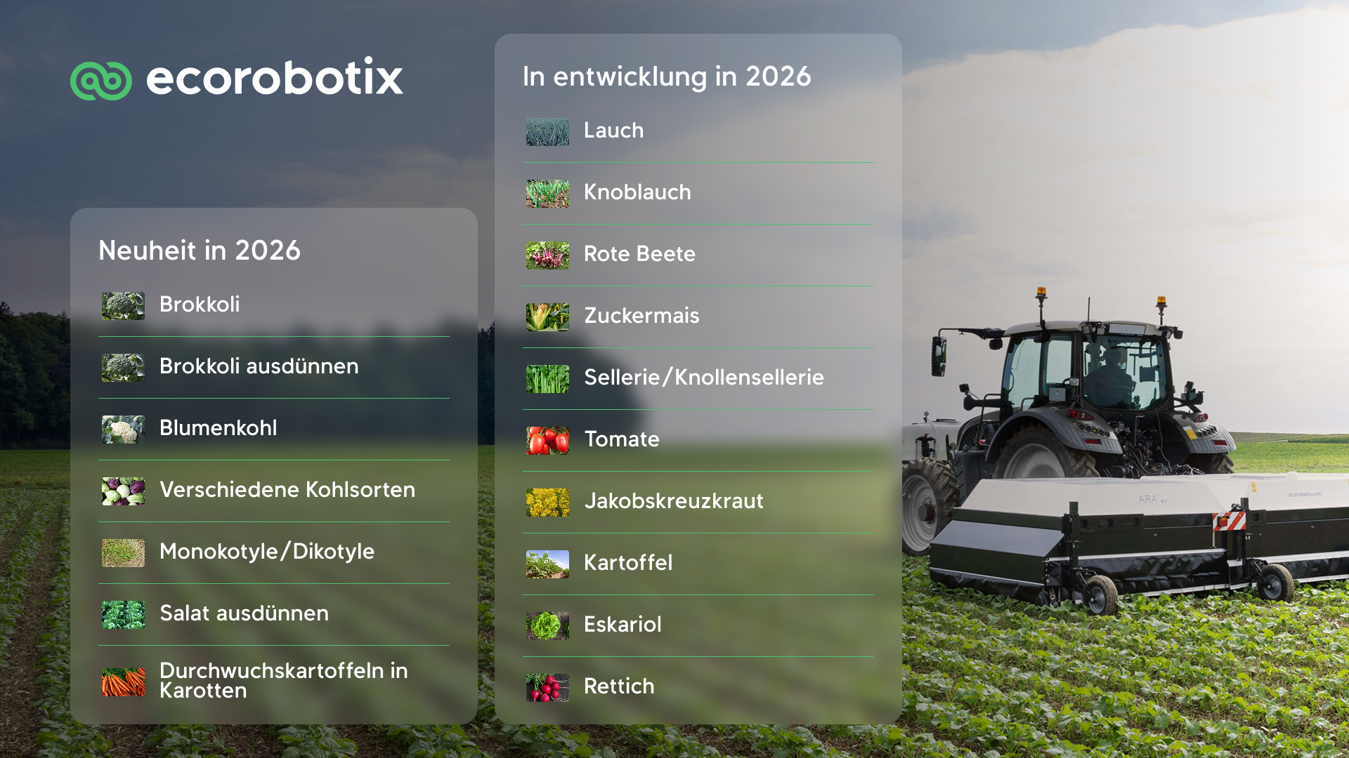Mit der Einführung der Algorithmen 2026, die ab März nächsten Jahres verfügbar sind, hebt Ecorobotix den präzisen Gemüsebau auf ein neues Niveau. Dank der Plant-by-Plant™-Künstlichen Intelligenz ist es nun möglich, nicht-selektive Herbizide selektiv einzusetzen, selbst in empfindlichen Kulturen wie Brokkoli und Blumenkohl.