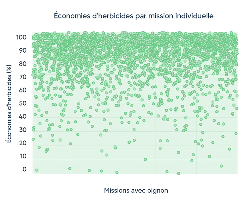 Cada ponto mostra a economia de herbicida para cada missão individual conduzida pelo ARA™ em cebolas em 2023.