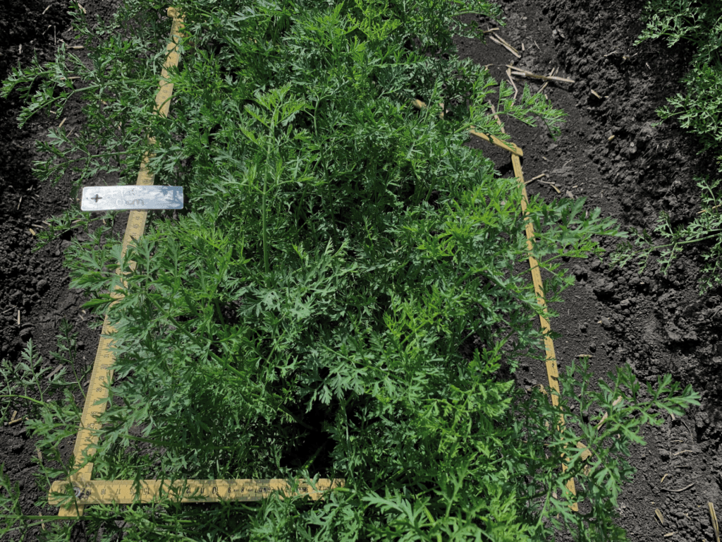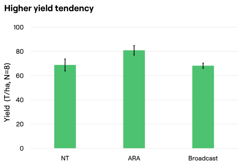 O aumento da produção de biomassa é indicado pelo fechamento mais precoce das fileiras de cultivo nos tratamentos com ARA™ em comparação com o tratamento por semeadura a lanço. Essa observação sugere uma tendência para rendimentos mais elevados nos tratamentos com ARA™.