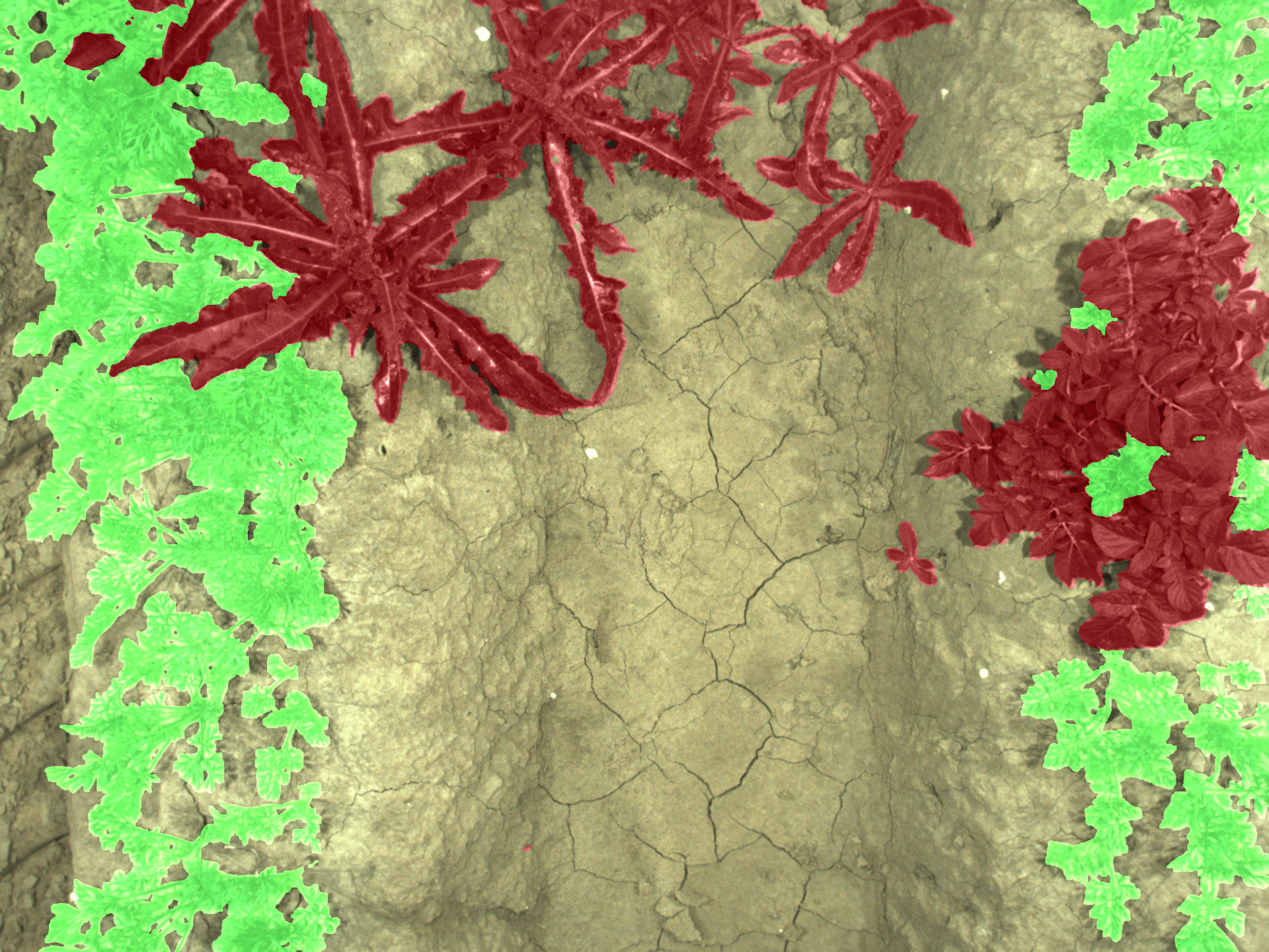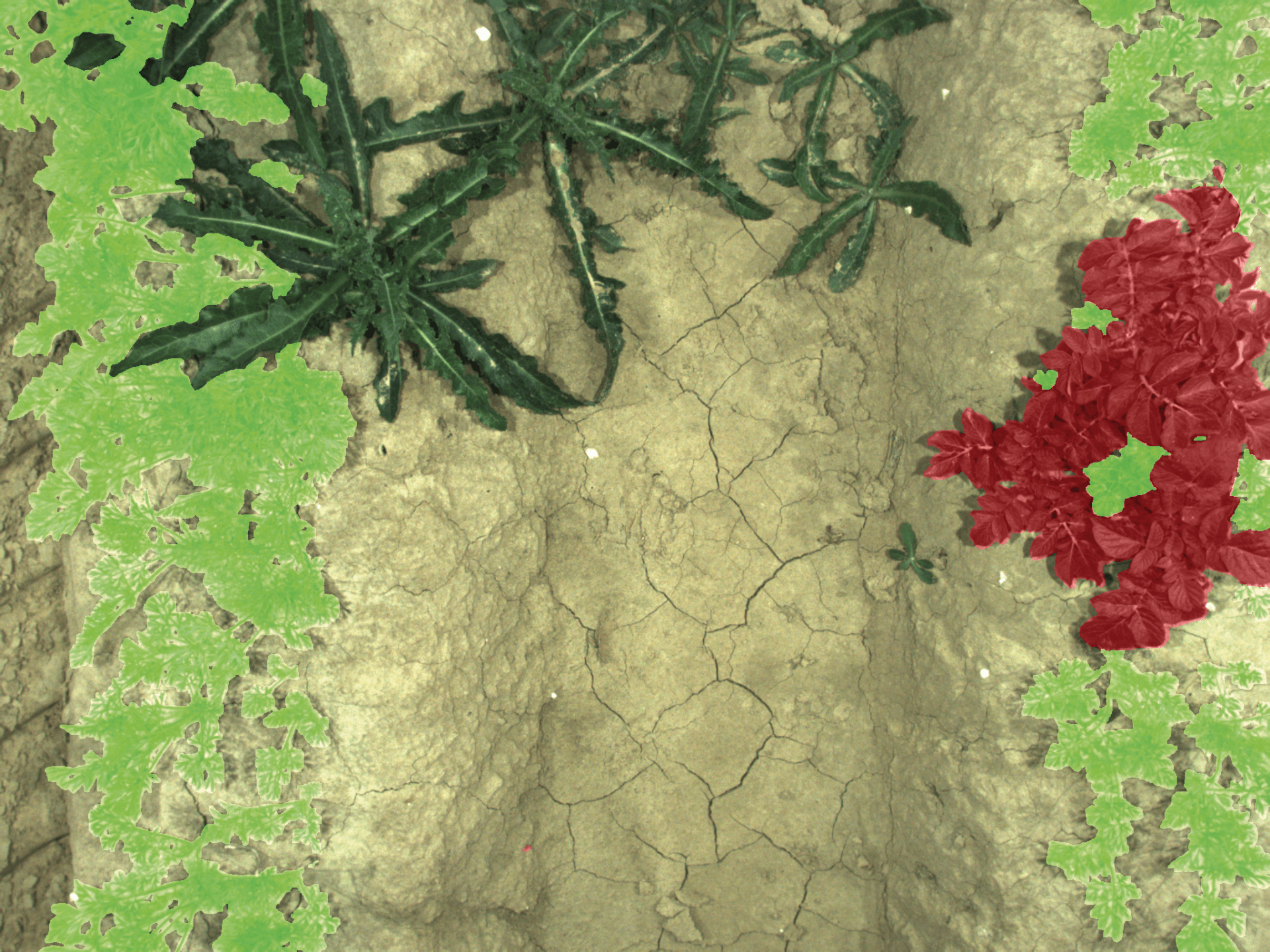 Vermelho: ervas daninhas visadas, Verde: cultura