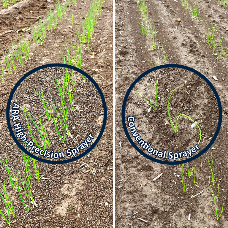 The team noted a clear growth defect on the onions sprayed with the conventional sprayer, the onions are considerably smaller than the onions in the plots treated with ARA. Overall crop health with the ARA sprayer seems much higher than with the conventional spraying method, even when increasing the dosages of the herbicides used.